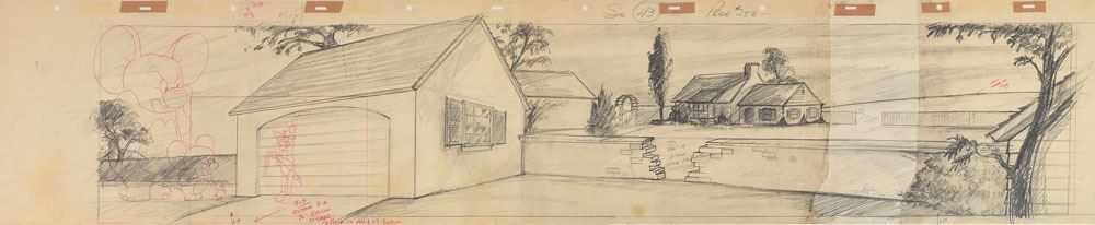 (MGM Studios, 1953) Impressive original production panoramic drawing featuring Tom and Jerry, the baby elephant Jumbo, and Jumbo's mother (dressed as mice) from the short 'Jerry and Jumbo,' showing their confrontation in the final scene. Accomplished in graphite and colored pencil on several sheets of animation paper affixed side-by-side to an overall size of 49.5 x 10.5. In fine condition.