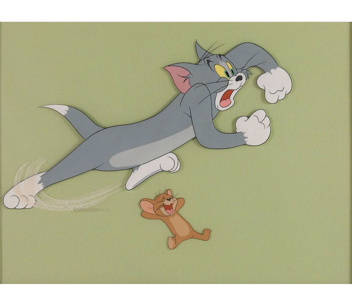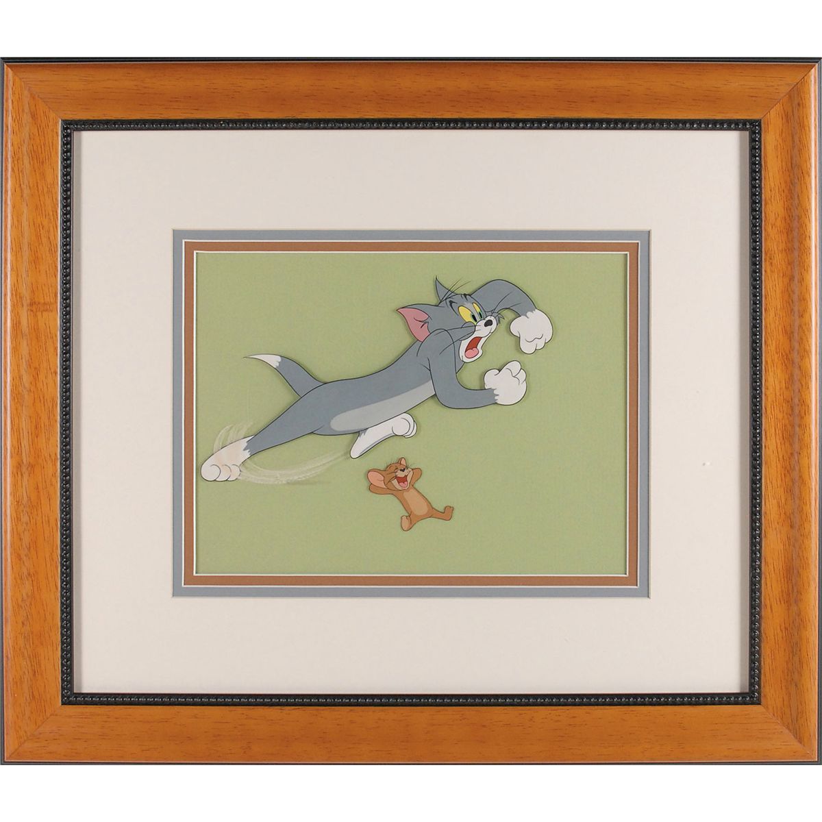 (MGM Studios, early 1950s) Original production cel featuring Tom and Jerry from a 1950s theatrical cartoon, showing Tom mid-sprint and Jerry laughing wildly. The cel is placed on a green background. Image measures 8 x 6, with a mat opening of 10 x 7.5. This piece is also framed to an overall size of 19 x 16.5. In fine condition. A great action shot of the classic cartoon characters, nicely embellished to portray Tom’s wild movement as he gives chase.