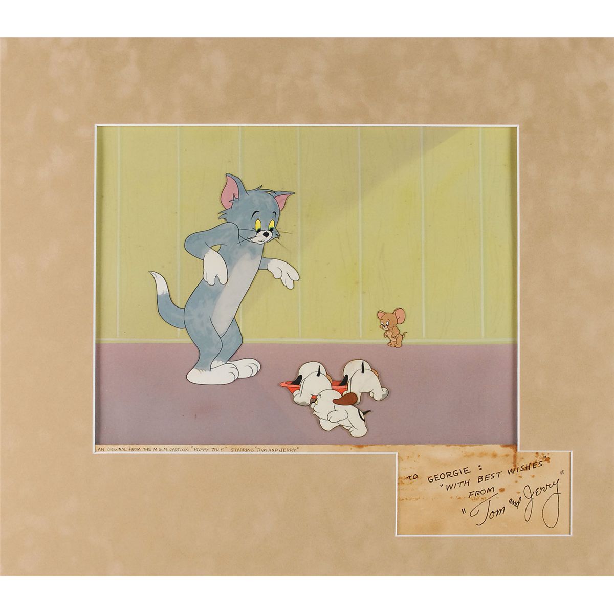 (MGM Studios, 1954) Original production cels and hand-painted background setup featuring Tom and Jerry from Puppy Tale. The puppies are trimmed to image and applied to the full Tom and Jerry cel. Puppies measure 3 x 2.25, Tom measures 4 x 6, and Jerry measures .75 x 1. The mat opening measures 11.25 x 8.5, with the bottom of the original MGM mat signed and inscribed in black ink, “To Georgie: ‘With best wishes’ from ‘Tom and Jerry,’” and labeled along the edge, “An original from the M.G.M. Cartoon ‘Puppy Tale’ starring ‘Tom and Jerry.’” The remainder of the original mat has been suede-matted and framed to an overall size of 17 x 15. Scattered toning and dampstaining to original mat, otherwise fine condition. In its original run, Hanna and Barbera produced 114 Tom and Jerry shorts for Metro-Goldwyn-Mayer from 1940 to 1957. During this time, they won seven Academy Awards for Animated Short Film, tying for first place with Walt Disney's Silly Symphonies with the most awards in the category.