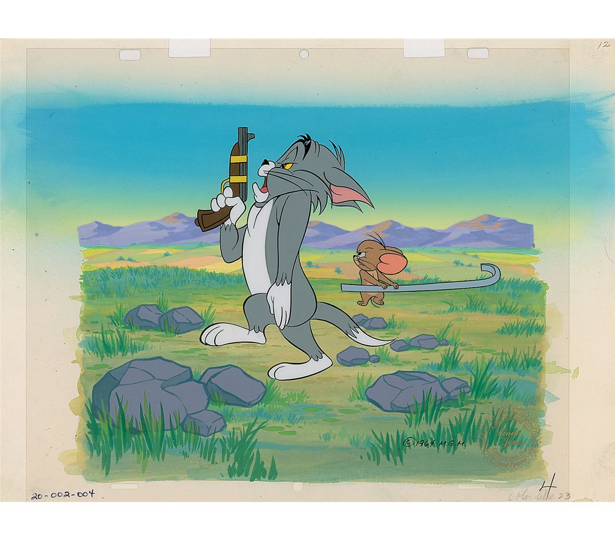 (MGM Studios, 1964) Original production cels on a hand-painted background featuring Tom and Jerry from Tom and Jerry. The cel is placed on a hand-painted background. Image measures 7 x 6, with overall dimensions of 14.25 x 10.75. The piece has the Linda Jones Enterprises seal on lower right. In fine condition.