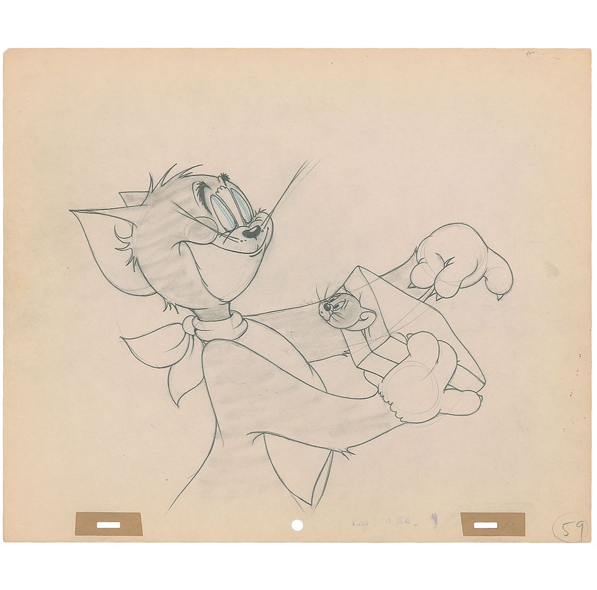 (MGM Studios, 1945) Original production drawing featuring Tom and Jerry from Flirty Birdy, showing Tom delightedly preparing his Jerry sandwich. Accomplished in graphite and colored pencil on untrimmed 12.5 x 10.5 animation paper. Image measures 9.5 x 7.5. In fine condition.