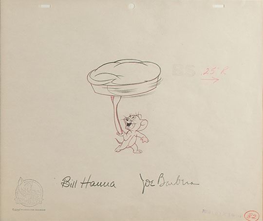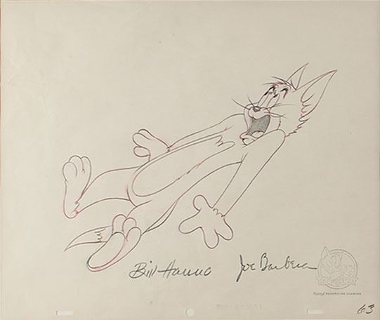 (Hanna-Barbera Studios, 1948) Two original production drawings featuring Tom and Jerry from Mouse Cleaning, each signed in pencil, "Bill Hanna" and "Joe Barbera." Accomplished in graphite and colored pencil on individual sheets of 12.5 x 10.5 animation paper. Tom measures 8.75 x 6.5 and the Jerry image measures 3.5 x 4.5. Both bear "Tom and Jerry Original Production Drawing" ink stamps to lower corners. In overall fine condition.