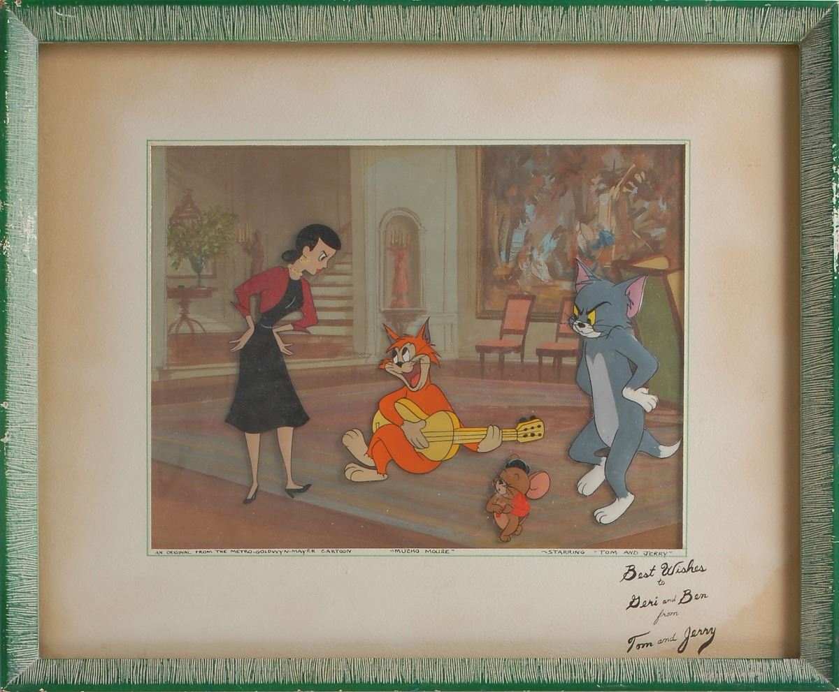 (MGM Studios, 1957) Original production key master background set-up featuring Tom, Jerry, Lightning, and Joan from Mucho Mouse, displayed in its original MGM presentation mat. The cel is placed on a hand-painted production key master background. Characters are trimmed to image and measure from 1.5 x 1.75 to 2.5 x 5.5, with a mat opening of 11 x 8.25. This piece is also framed to an overall size of 17 x 14. In fine condition, with some staining to mat.