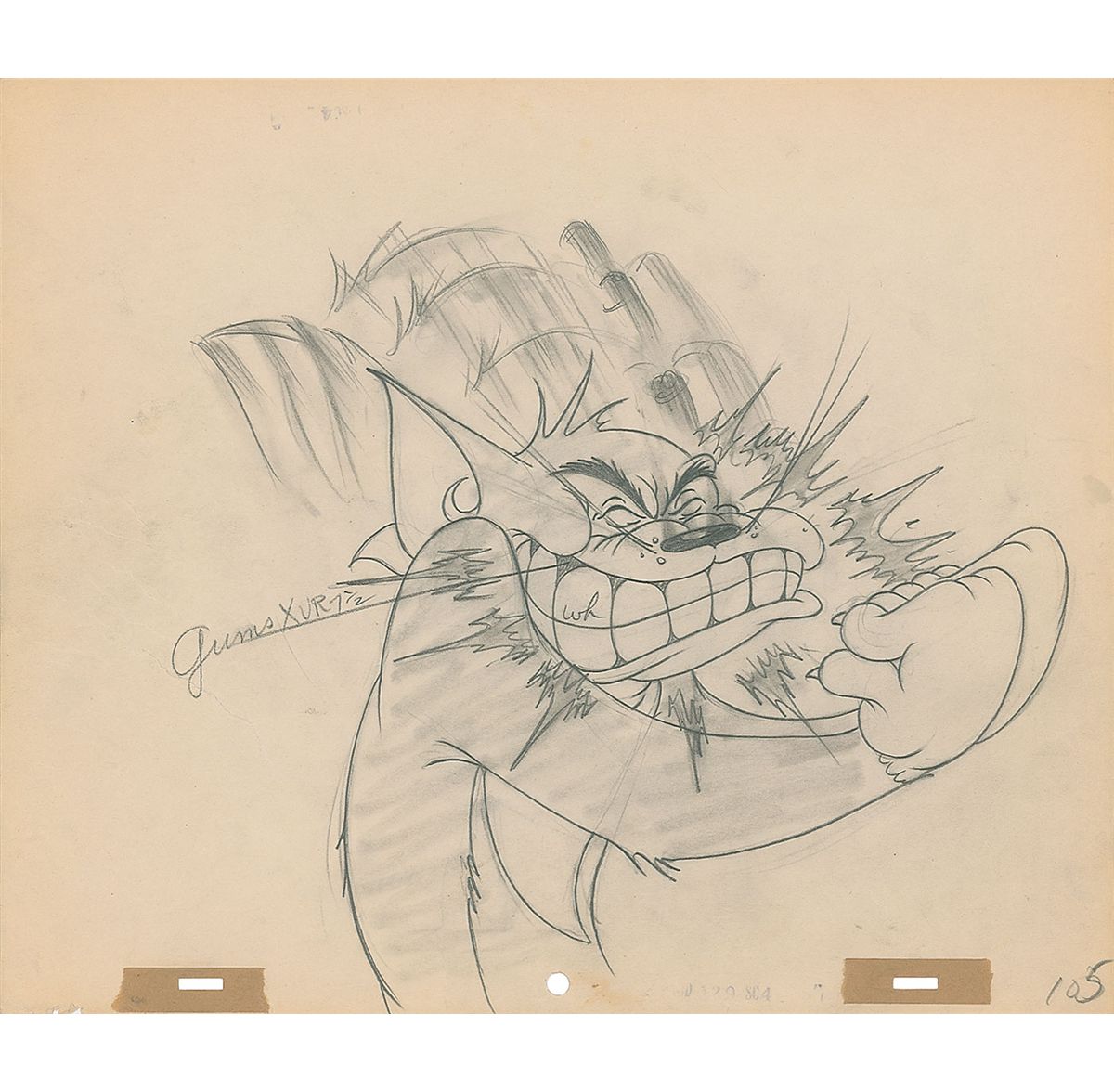 (MGM Studios, 1945) Original set of two production drawings in sequence featuring Tom and Jerry from Flirty Birdy, showing Tom about to eat a sandwich with Jerry inside, and his exasperated chomp after an eagle snatches the sandwich from his paws. Accomplished in graphite on two sheets of untrimmed 12.5 x 10.5 animation paper. Images measure 9 x 7 and 10 x 9. In overall fine condition, with a few creases.