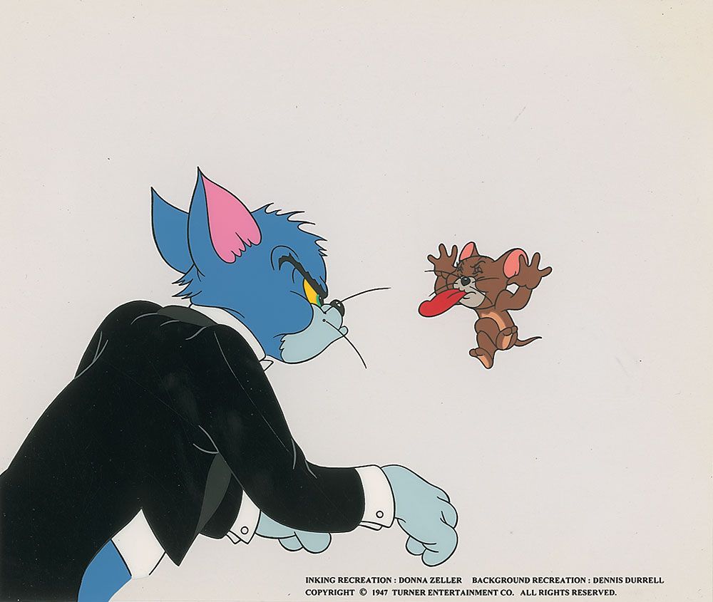 Color hand-painted publicity cel of Tom and Jerry on a 12.5 x 10.5 acetate sheet. Cel bears a printed Turner Entertainment copyright notice to the lower right. In fine condition.