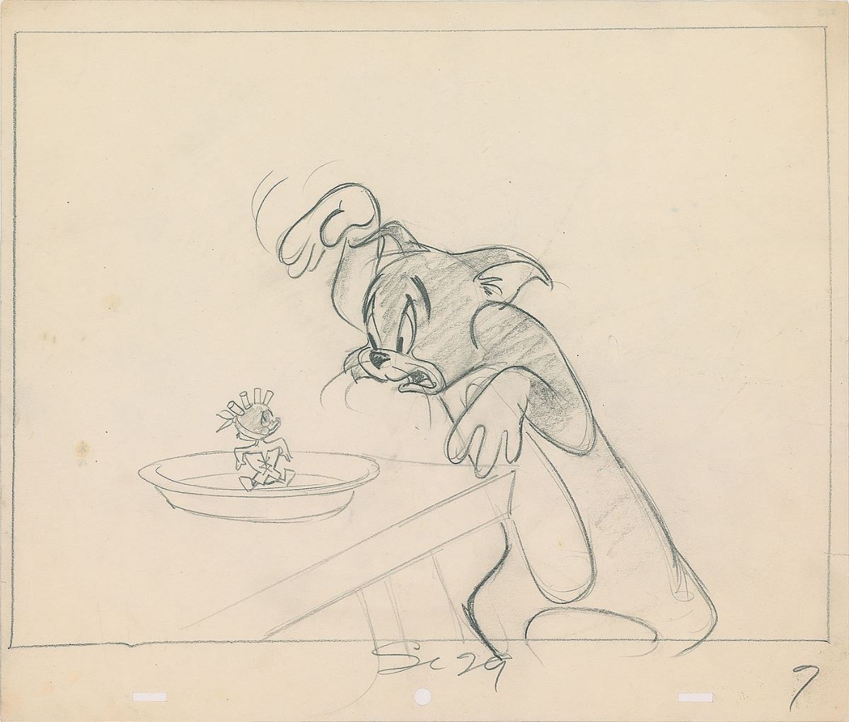 (MGM Studios, 1954) Original production layout drawing featuring Tom and Quacker from Downhearted Duckling, portraying the sad duckling sitting in Tom’s plate. Accomplished in graphite on untrimmed 12.5 x 10.5 animation paper. Image measures 8.5 x 6.75. In fine condition.