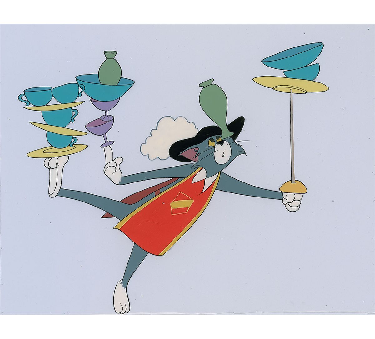 (MGM Studios, 1958) Original production cel featuring Tom impressively balancing plates in Royal Cat Nap. The cel is slightly trimmed to 10 x 8. Image measures 8 x 7. In fine condition.