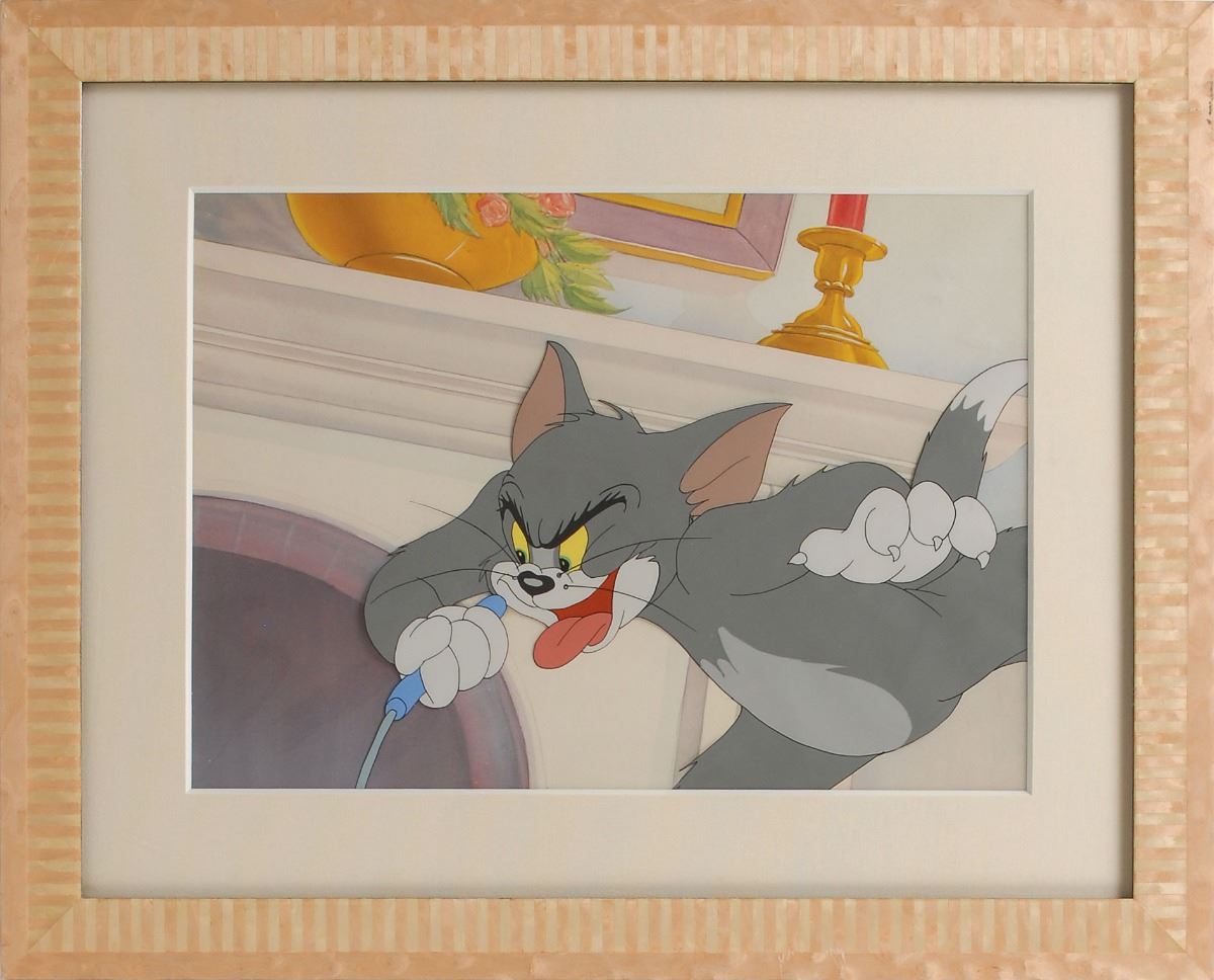 (MGM Studios, circa late 1940s) Original production cel from a Tom and Jerry cartoon, showing Tom in a particularly diabolical pose with sharp claws and tongue jutting out. The cel is placed on a hand-painted production background. Image measures 9.5 x 6.25, with a mat opening of 12 x 8.5. This piece is also framed to an overall size of 17.25 x 13.75. In fine condition. An ideal depiction of Tom at his most menacing.
