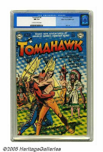 <B>Tomahawk #5 Mile High pedigree (DC, 1951) CGC NM 9.4 Off-white to white pages.</B></I> We almost didn't recognize Tomahawk without his buckskin outfit on this Bruno Premiani cover! The book's interior art is also by Premiani; Leonard Starr drew a backup feature. We're pleased to bring you a number of Mile High books in this auction, and like so many from Edgar Church's hoard, this one's the highest-graded copy of the issue that CGC has certified to date. Overstreet 2005 NM- 9.2 value = $475. CGC census 2/05: 1 in 9.4, none higher.
