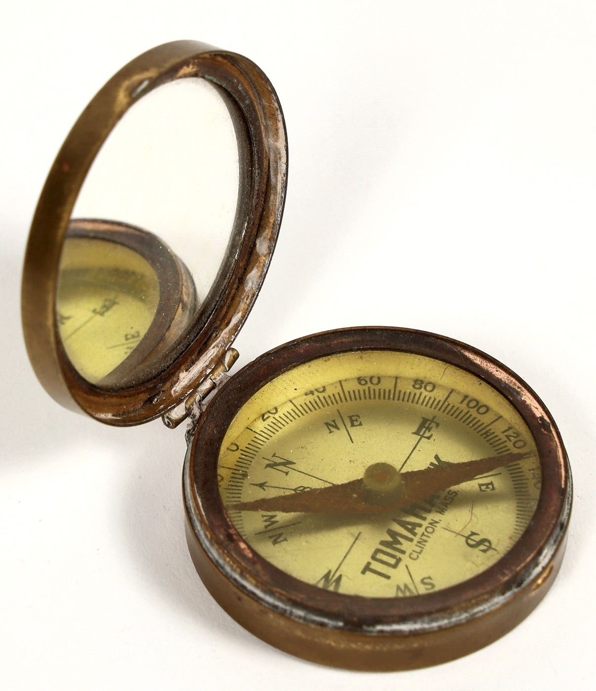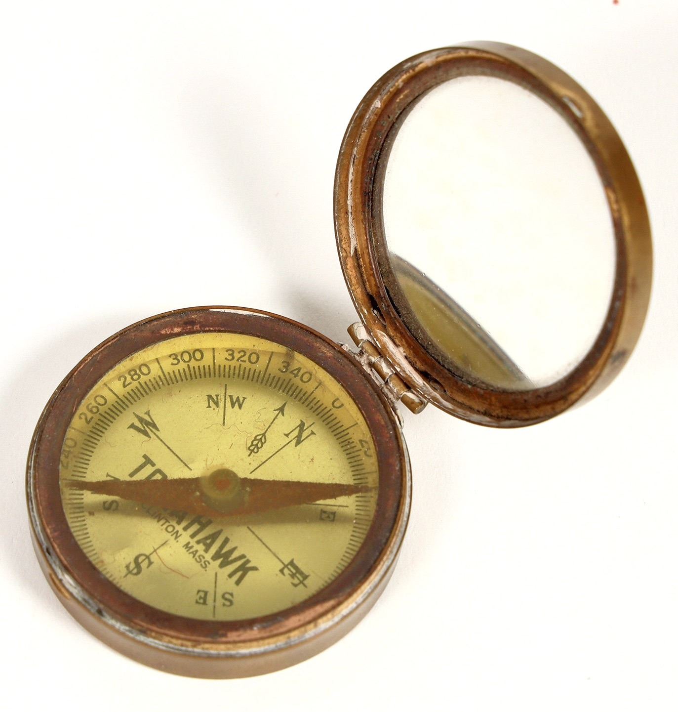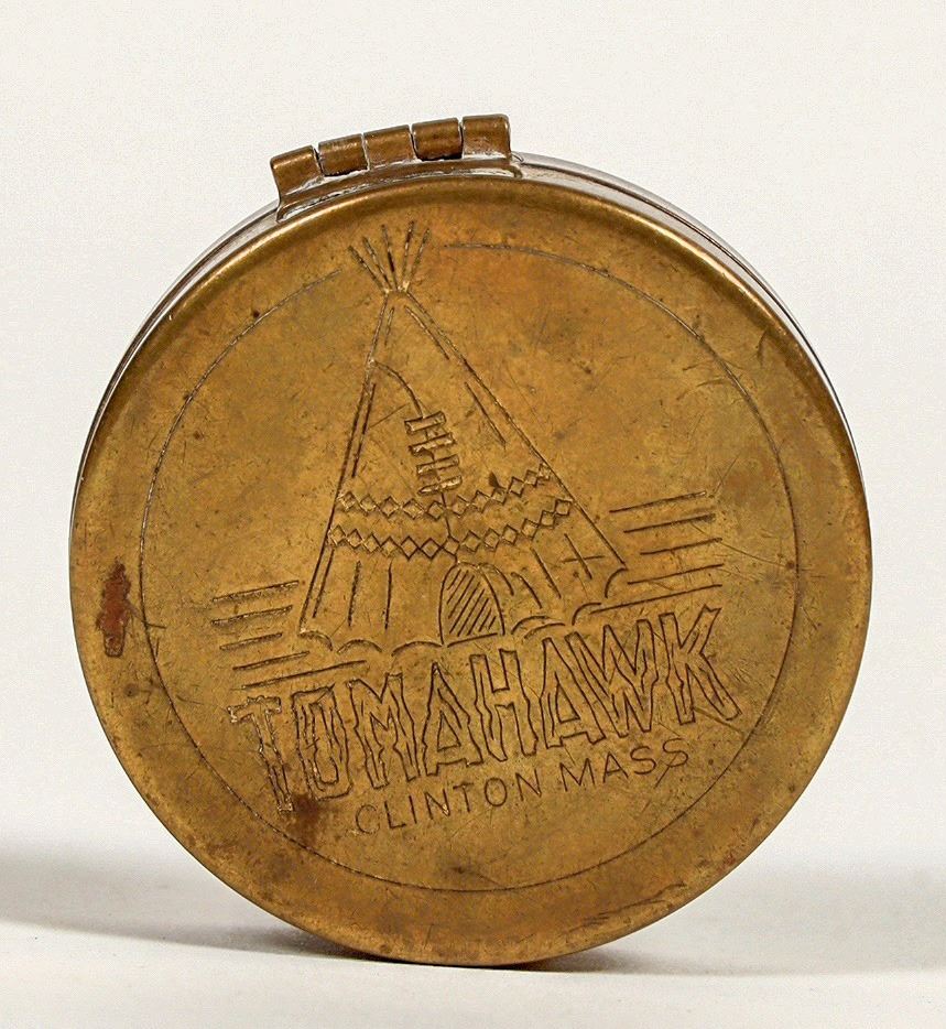 This is a Tomahawk compass made in Clinton, Mass. A teepee is press engraved into the cover. The card is bright brass with an inclination indicator about 13 degrees west. The needle is rusted but still functions well. The case is also oxidized. There is a small mirror on the inside cover. This may not be cosmetic or hygiene but for signaling purposes. A rare find. 1.625 in. diameter. Please see photo for details.