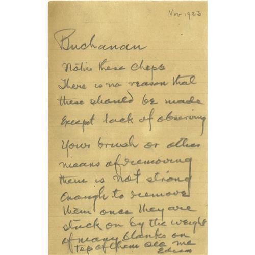 <B>Thomas A. Edison Autograph Note Signed,</B></I> "<I>Edison</B></I>", one page, 5" x 8", n. p., November, 1923. It reads: "<I>Buchanan Note these chips. There is no reason these should be made except lack of observing your brush or other means of removing them once they are stuck on by the weight of many blanks on top of them. See me.</B></I>" Toned paper, very fine condition. Jaffrey P. Buchanan was manager of Edison Records Disc Division.<BR><BR><b>Shipping:</b> Flat Material, Small (<a target="_blank" href="http://www.heritageauctions.com/common/shipping.php">view shipping information</a>)