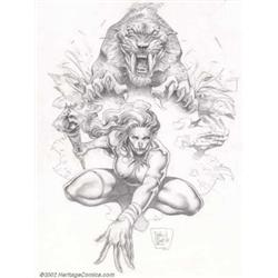 Tomas Giorello - Original Illustration, "Sabre-Tooth" (undated). An up-and-coming young Argentinian artist, Giorello is best known for his penciled covers to DC's Knockout comics and his painted covers for Heavy Metal. This incredibly graceful piece, fully rendered in subtle tonal pencils, measures approximately 11.5" x 15" and is in excellent condition. Signed by the artist in the lower part of the piece, it would be difficult to find a better example of contemporary "good girl" art than this. Important notice: We expect to be auctioning lots at the rate of 200-250 per hour. Sometimes eBay Premier live bid software cannot keep up with that pace, so we strongly recommend that you place a realistic proxy bid now as insurance to avoid disappointment. Also please note that all Heritage/CAA lots purchased through eBay Premier carry a 20% Buyer's Premium. Please make sure you read the Terms and Conditions.