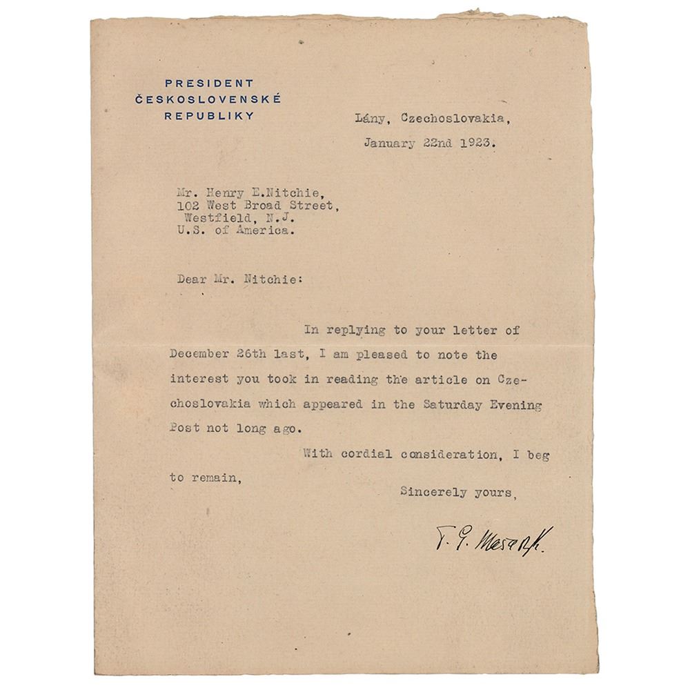 Founder and first President of Czechoslovakia (1850–1937). TLS signed “T. G. Masaryk,” one page, 6.75 x 8.75, President of Czechoslovakia letterhead, January 22, 1923. Letter to Henry E. Nitchie, in full: “In replying to your letter of December 26th last, I am pleased to note the interest you took in reading the article on Czechoslovakia which appeared in the Saturday Evening Post not long ago.” In fine condition.