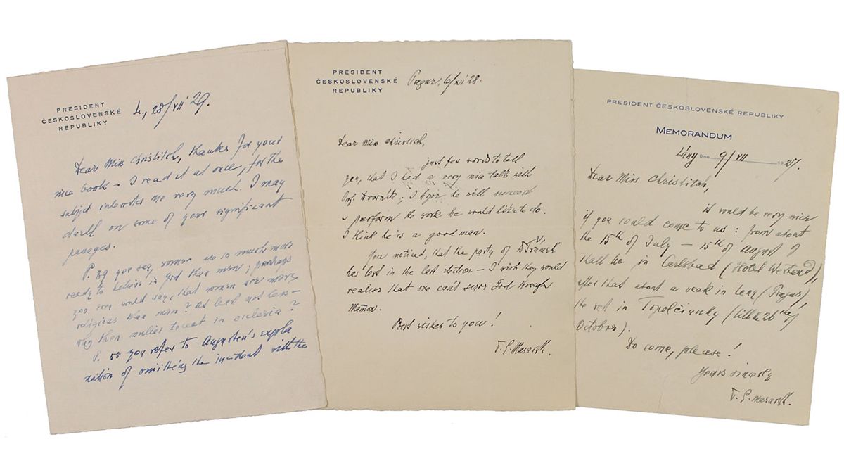 Founder and first president of Czechoslovakia (1850–1937). Three ALSs in English, signed “T. G. Masaryk,” Czechoslovakian presidential letterhead, dated from 1927 to 1929. Letters to English journalist Annie Christich. First is one page, in part: “It would be very nice if you would come to us…I shall be in Carlsbad.” Second is one page, in part: “You noticed, that the party of D[r.] Tramek has lost in the last election—I wish they would realize that one can’t serve God through Mamon.” Third is three pages on two adjoining sheets, in part: “Thanks for your nice book—I read it at once, for the subject interests me very much. I may dwell on some of your significant passages. P. 39. You say, women are so much more ready to believe in God than men; perhaps you would say, that women are more religious than men? At least not less—why then mulier taceat in ecclesia [women are to be silent in church]?” In overall fine condition, with noticeable tears to the top and bottom edges of first letter. All three accompanied by their original transmittal envelopes, one addressed in Masaryk’s hand.