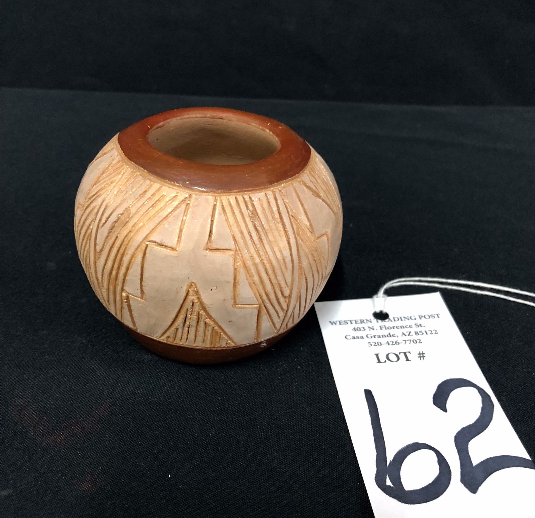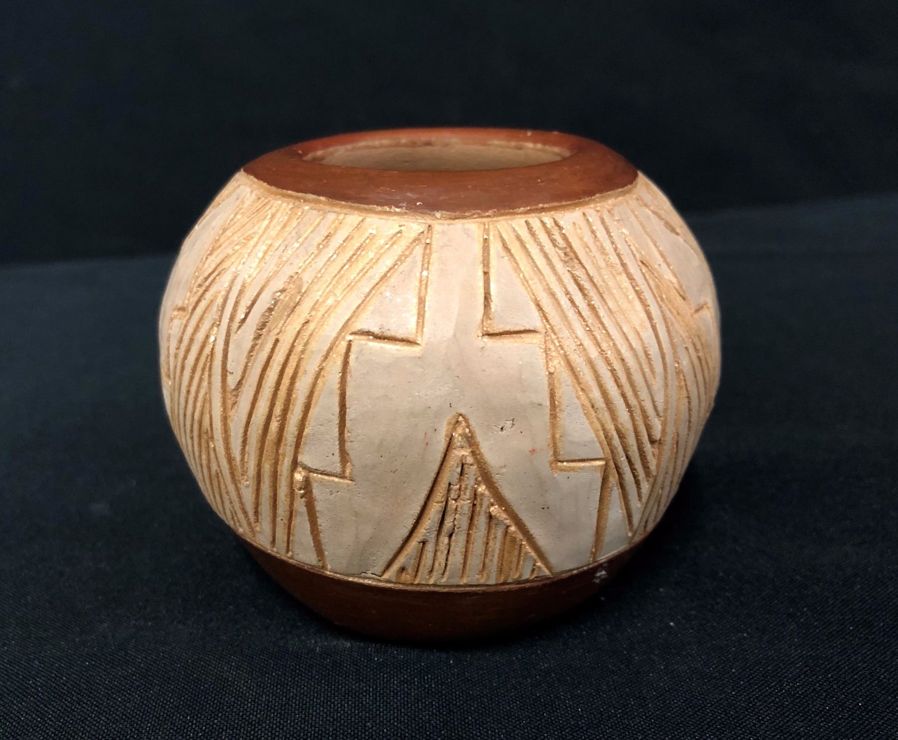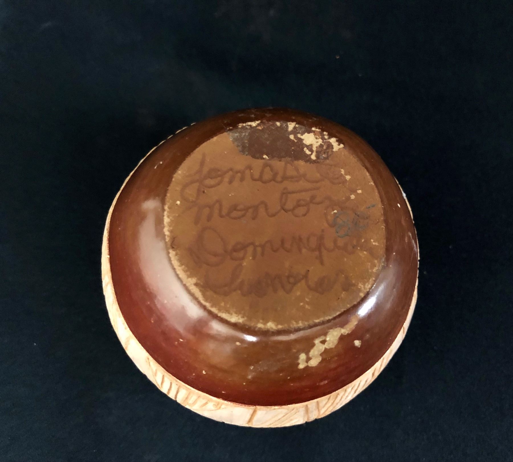 Maker: Tomisita Montoya (1899-1978) and Dominique Sisneros. Approx. Age: Vintage. Size: Measures 3 1/4” w x 3” h. Additional Info: Vintage San Juan Pot by Tomisita Montoya and Dominique Sisneros. Condition: Good for it’s age, normal wear and fading expected. Please look closely at the pictures - they are an important part of our description. Shipping: There will be a $7 handling / packaging fee for shipping this lot. The actual cost of postage will be added on top of that.