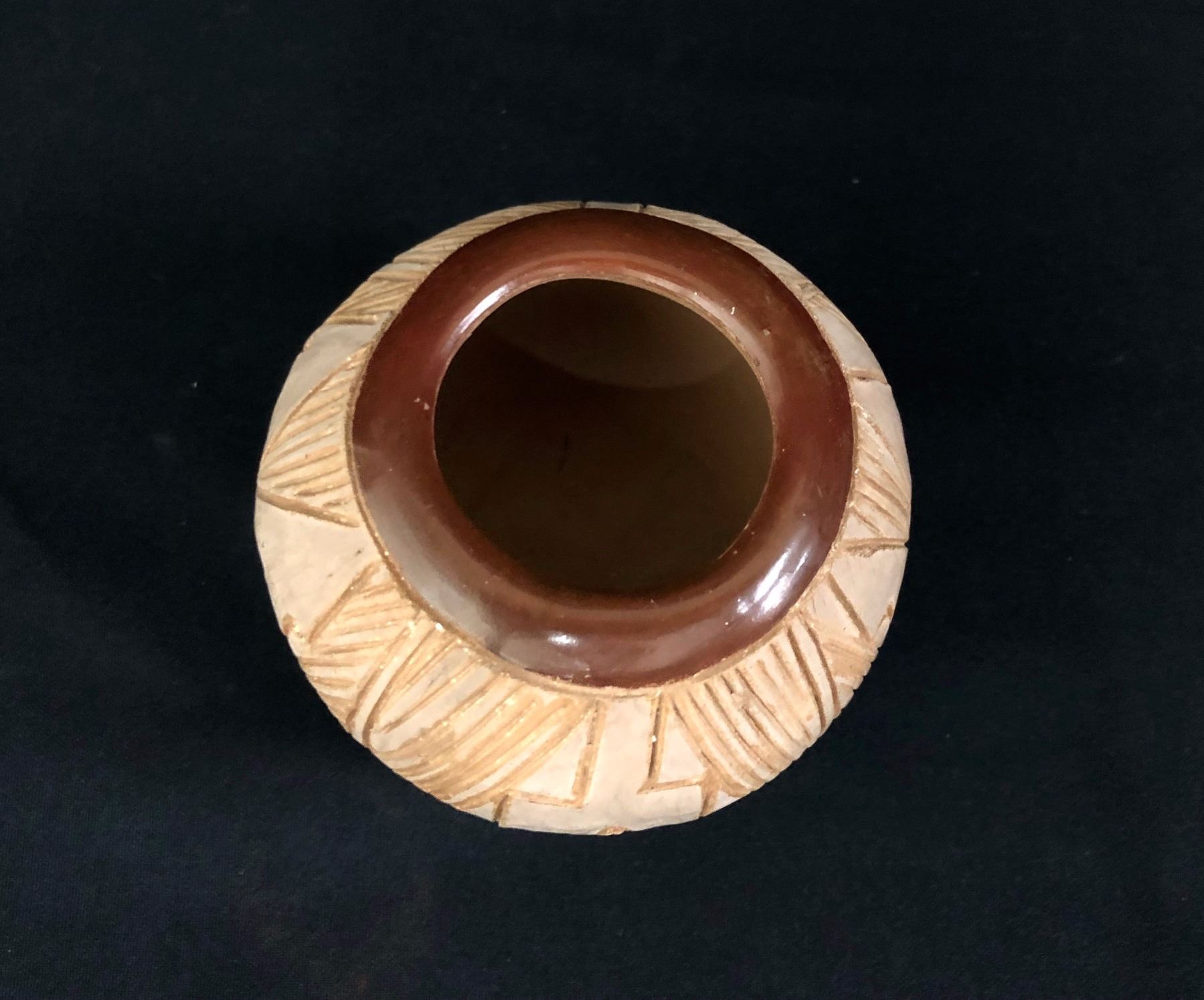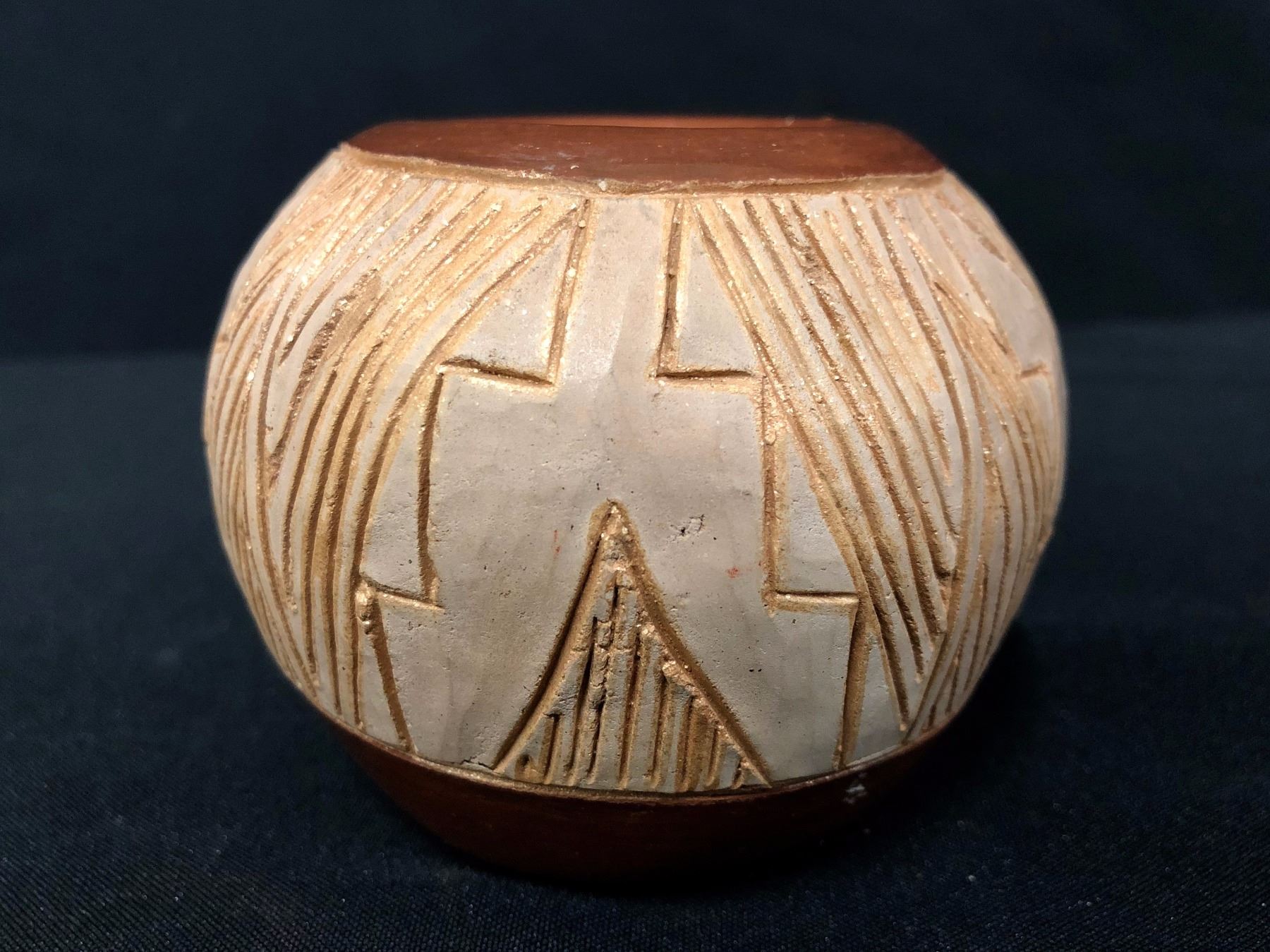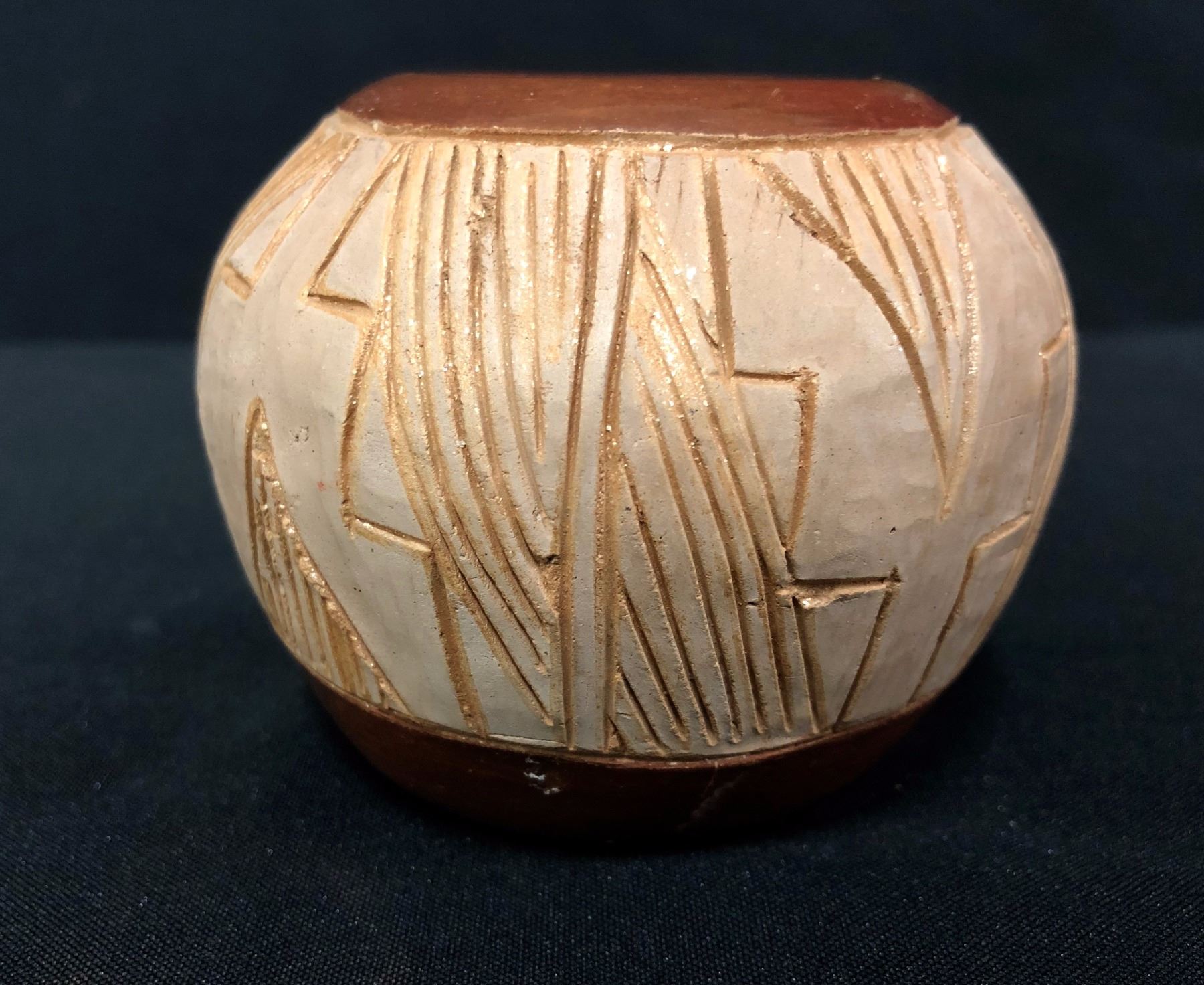 Maker: Tomisita Montoya (1899-1978) and Dominique Sisneros. Approx. Age: Vintage. Size: Measures 3 1/4” w x 3” h. Additional Info: Vintage San Juan Pot by Tomisita Montoya and Dominique Sisneros. Condition: Good for it’s age, normal wear and fading expected. Please look closely at the pictures - they are an important part of our description. Shipping: There will be a $7 handling / packaging fee for shipping this lot. The actual cost of postage will be added on top of that.
