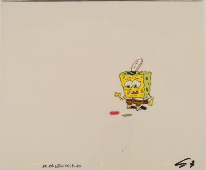 This original animation cel is from the Nickelodeon TV show SpongeBob Squarepants. The story takes place under the deep blue sea in Bikini Bottom, where SpongeBob resides. SpongeBob, who is a yellow, porous sponge, is your typical happy-go-lucky character, as he is always cheerful and enjoys making people laugh. Patrick Star, SpongeBob's neighbor who is a starfish, is your average children's show idiot, as he boasts knowing nothing and is often getting himself into ridiculous situations. Between the homes of these two lies the home of the miserable Squidward, a squid, who is known for being grouchy and playing tricks on SpongeBob and Patrick. Both SpongeBob and Squidward work at the Krusty Krab, a fast food business run by the greedy money-loving Mr. Krabs, a crab, the arch rival of the evil, possibly misunderstood, Plankton. Another neighbor, Sandy Cheeks, an athletic squirrel who normally wears an astronaut's space suit, was introduced in "Tea at the Treedome." She spends most of her time inventing and experimenting.It appears that SpongeBob dropped the lettuce and tomato.Original Production Animated Cel Overall Size of Cel: 10 1/2" x 12 1/2" Very Good ConditionThis is an original hand-painted cel set-up used in the production of an episode of "SpongeBob SquarePants." Each one-of-a-kind set-up represents a slight change in position of the characters. When individually photographed and projected in rapid succession, the images appear to move.