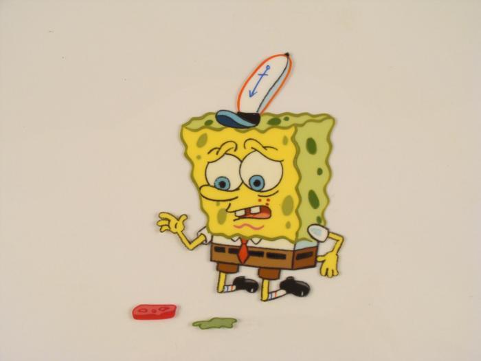 This original animation cel is from the Nickelodeon TV show SpongeBob Squarepants. The story takes place under the deep blue sea in Bikini Bottom, where SpongeBob resides. SpongeBob, who is a yellow, porous sponge, is your typical happy-go-lucky character, as he is always cheerful and enjoys making people laugh. Patrick Star, SpongeBob's neighbor who is a starfish, is your average children's show idiot, as he boasts knowing nothing and is often getting himself into ridiculous situations. Between the homes of these two lies the home of the miserable Squidward, a squid, who is known for being grouchy and playing tricks on SpongeBob and Patrick. Both SpongeBob and Squidward work at the Krusty Krab, a fast food business run by the greedy money-loving Mr. Krabs, a crab, the arch rival of the evil, possibly misunderstood, Plankton. Another neighbor, Sandy Cheeks, an athletic squirrel who normally wears an astronaut's space suit, was introduced in "Tea at the Treedome." She spends most of her time inventing and experimenting.It appears that SpongeBob dropped the lettuce and tomato.Original Production Animated Cel Overall Size of Cel: 10 1/2" x 12 1/2" Very Good ConditionThis is an original hand-painted cel set-up used in the production of an episode of "SpongeBob SquarePants." Each one-of-a-kind set-up represents a slight change in position of the characters. When individually photographed and projected in rapid succession, the images appear to move.