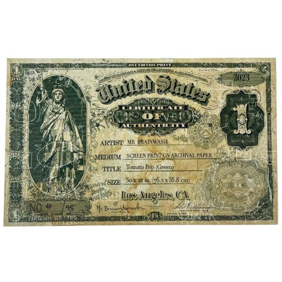 "Tomato Pop (Green)" is a limited edition uniquely hand-finished silk screen print on paper by Mr Brainwash. The piece is hand signed and thumb-printed by the artist. The piece comes custom framed and with a Certificate of Authenticity. Measures approximately 42" x 34" (framed), 30" x 22" (image). This item requires special handling and may have a longer than usual turnaround.
