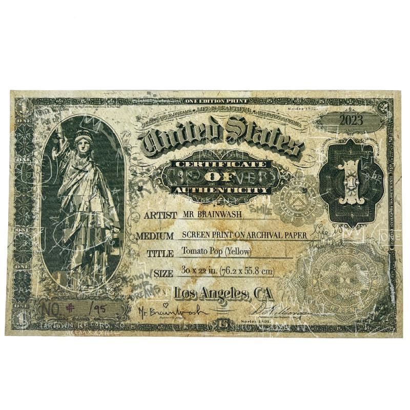 "Tomato Pop (Yellow)" is a limited edition uniquely hand-finished silk screen print on paper by Mr Brainwash. The piece is hand signed and thumb-printed by the artist. The piece comes custom framed and with a Certificate of Authenticity. Measures approximately 42" x 34" (framed) 30" x 22" (image).