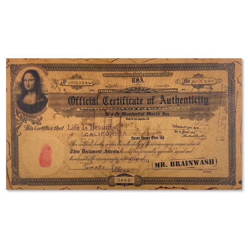 "Tomato Pop" is a unique (UNIQ) mixed media on deckle edge paper by Mr. Brainwash, hand signed and bearing the thumbprint of the artist inverso. This piece comes custom framed. Includes Certificate of Authenticity. Measures approx. 34" x 26" (frame), 30" x 22" (image).