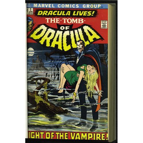 <B>Tomb of Dracula #1-40 Bound Volumes Plus (Marvel, 1972-75).</B></I> This pair of volumes features copies of <B>Tomb of Dracula</B></I> #1-40; <B>Giant-Size Chillers</B></I> #1; and <B>Giant-Size Dracula</B></I> #2-5 that have been trimmed and bound into a hardcover volume with the previous owner's name stamped on the cover. Plenty of wonderful artwork by Gene Colan, plus John Byrne's first art for Marvel (in <B>Giant-Size Dracula</B></I> #5). Overstreet 2006 VG 4.0 value for group = $356. <BR><BR><B>Important notice:</B> Heritage usually auctions material at the rate of 200-250 lots per hour. On some occasions eBay Live bid software or the Internet may not be able to keep up with the pace of the auction. We recommend placing a realistic absentee bid now as insurance to avoid disappointment. Occasionally the auctioneer may eliminate or reject an eBay Live bid, and the auctioneer may also reopen a lot after the close of the eBay live bidding (usually because we missed an audience bid), and may reject your bid even if it shows you as the winning bidder. By bidding via eBay Live, you agree that Heritage may award the lot to another bidder at its sole discretion under the circumstances described above or any other reasonable circumstances. Since eBay bids are not shown to us until we open the lot on the floor, we treat those bids just like floor bids. In most cases the floor responds before the eBay bid is presented to us, due to Internet lag time, so for consistency we have made it a policy that floor bids are always considered first over tie eBay live bids. Also please note that all Heritage lots purchased through eBay Live carry a 22.5% Buyer's Premium. Please make sure you read the Terms and Conditions before you bid. This lot is being auctioned in conjunction with a live floor auction by Heritage Auction Galleries. All final auction and invoice information will be supplied by Heritage Auction Galleries, and all other information should be considered preliminary. Lot:41001 <BR><BR><B>Winning Notification and Billing:</B> After the FINAL session in this auction is complete, Heritage will send e-mail and snail mail invoices. This process normally takes several days. All final auction and invoice information will be supplied by Heritage Auction Galleries, and all other information should be considered preliminary. <BR><BR>This auction will be conducted on a live auction floor and over the Internet through eBay Live. If you choose to place an absentee bid, please take a moment to <font color='#0000ff'><u><a href='http://pages.ebay.com/liveauctions/help/before/laabsentee.html'>learn how eBay Live absentee bidding works</a></u></font><font color='#000000'>