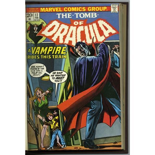 <B>Tomb of Dracula #17-32 Bound Volume (Marvel, 1974-75).</B></I> The first appearance and origin of Hannibal King (#25) is among the highlights of the comics collected here, all of which have moody art by the great Gene Colan. These are trimmed copies which have been bound into a maroon hardcover volume. The condition of the comics is outstanding, with superb cover gloss and off-white to white pages. Overstreet 2006 VG 4.0 value for group = $82. <BR><BR><B>Important notice:</B> Heritage usually auctions material at the rate of 200-250 lots per hour. On some occasions eBay Live bid software or the Internet may not be able to keep up with the pace of the auction. We recommend placing a realistic absentee bid now as insurance to avoid disappointment. Occasionally the auctioneer may eliminate or reject an eBay Live bid, and the auctioneer may also reopen a lot after the close of the eBay live bidding (usually because we missed an audience bid), and may reject your bid even if it shows you as the winning bidder. By bidding via eBay Live, you agree that Heritage may award the lot to another bidder at its sole discretion under the circumstances described above or any other reasonable circumstances. Since eBay bids are not shown to us until we open the lot on the floor, we treat those bids just like floor bids. In most cases the floor responds before the eBay bid is presented to us, due to Internet lag time, so for consistency we have made it a policy that floor bids are always considered first over tie eBay live bids. Also please note that all Heritage lots purchased through eBay Live carry a 22.5% Buyer's Premium. Please make sure you read the Terms and Conditions before you bid. This lot is being auctioned in conjunction with a live floor auction by Heritage Auction Galleries. All final auction and invoice information will be supplied by Heritage Auction Galleries, and all other information should be considered preliminary. Lot:41001 <BR><BR><B>Winning Notification and Billing:</B> After the FINAL session in this auction is complete, Heritage will send e-mail and snail mail invoices. This process normally takes several days. All final auction and invoice information will be supplied by Heritage Auction Galleries, and all other information should be considered preliminary. <BR><BR>This auction will be conducted on a live auction floor and over the Internet through eBay Live. If you choose to place an absentee bid, please take a moment to <font color='#0000ff'><u><a href='http://pages.ebay.com/liveauctions/help/before/laabsentee.html'>learn how eBay Live absentee bidding works</a></u></font><font color='#000000'>