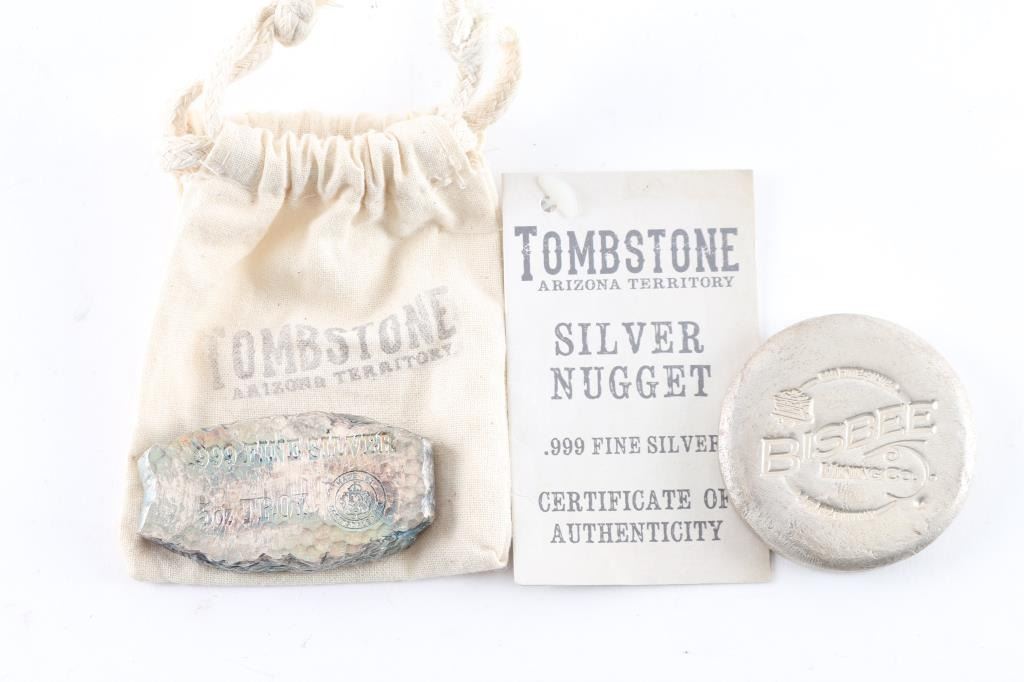 1) Tombstone .999 fine silver "nugget", rough stamped 5 Troy oz bar, with CoA. 2) Bisbee .999 fine silver, rough stamped 5 Troy oz disc.