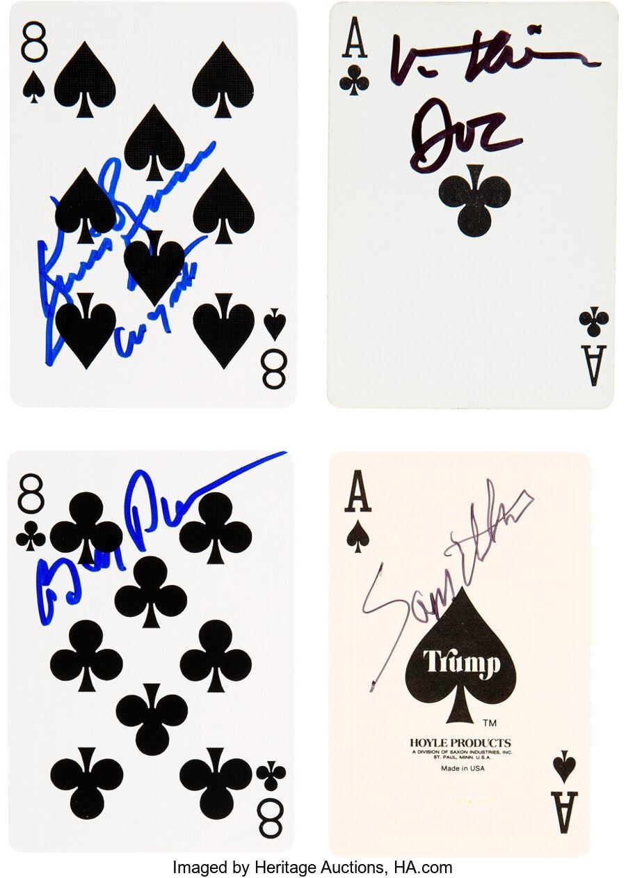 TombstoneCast Signed Playing Cards (4). Four playing cards (Ace of Spades, Ace of Clubs, 8 of Diamonds, and 8 of Clubs) signed by one of four stars from Tombstone. Signatures include: Kurt Russell, Val Kilmer, Sam Elliott, and Bill Paxton. These cards replicate the hand "Wild Bill" Hickok held when he died. Each card measures 2 ½" x 3 ½". Overall, in Near Mint Minus condition with minor edge toning. Comes with a printout of a webpage detailing the "dead man's hand" that Hickok held. COA from Heritage Auctions.
