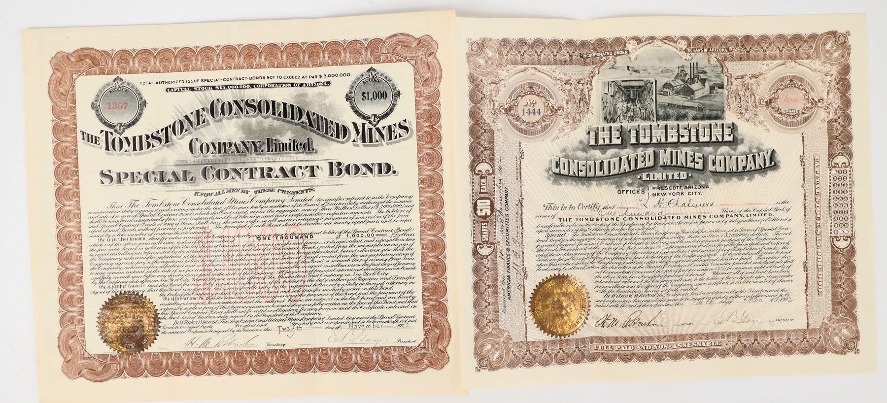 Lot of 2 different. 1) Stock no. 1444, issued in 1902 for 100 shares. Mining vignette. Not cancelled. 2) Bond for $1,000 issued in 1902, not cancelled. Both signed by EB Gage as president. EB Gage was a prominent Tombstone citizen and associate of Wyatt Earp. He was a superintendent of the Grand Central Mining Company, prominent entrepreneur, and developer of Tombstone Consolidated Mines in 1901. He was a prominent mining engineer and entrepreneur and was one of the notable Tombstone residents from the early days of the towns mining boom. He was primarily responsible for the second boom in 1886 when he discovered a way to rid the mines of the flooding which ended much of the town's success in 1881. Gage also helped transform Tempe from a sleepy rural village and organized the Tempe Land and Improvement Company.