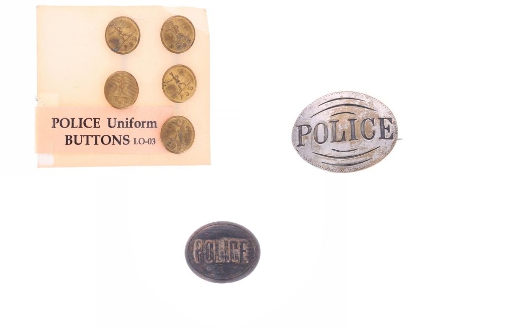 Featured in this lot is this collection of police badge and uniform buttons circa 1890 to 1920 and were housed in the Tombstone Western Heritage Museum; Provenance: From the Tombstone Western Heritage Museum in Tombstone, Arizona. The collection includes a badge, five uniform buttons, and one larger "Police" button. The badge features a nickel plated brass construction that is marked "Police" with stamped decoration and is unmarked. The five brass uniform buttons shows a policeman with the inscription 'POD'; The buttons come with an original museum tag that reads as follows: Police Uniform Buttons LO-03.The last button is brass with a heavy patina and a ding in it and reads "Police" and is marked on the back as follows: Superior Quality. The condition of this museum badge and police uniform buttons is well preserved with the largest of the buttons showing oxidation consistent with an excavated item and some patina adorning the rest of the items but otherwise shows a well preserved overall condition. The measurements of this collection ranges from 1 5/8" x 1 1/4" to 5/8" x 5/8". The collective weight of this collection of police collectibles is 26.7g.