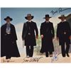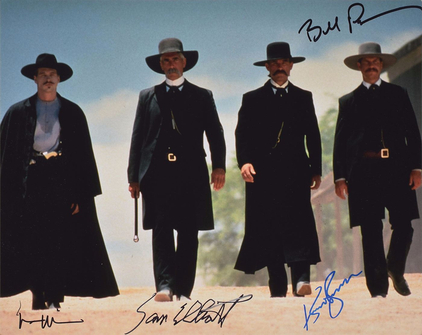 Color satin-finish 14 x 11 photo of the four lawmen from the 1993 film Tombstone, signed in felt tip by Kurt Russell, Val Kilmer, Sam Elliott, and Bill Paxton. In fine condition, with a slightly grainy quality to the image.