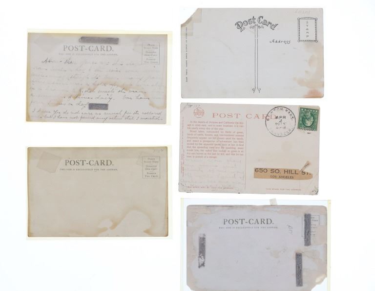 For your consideration is a Collection of Rare M. E. Fly Tombstone, Arizona Territory Photo Postcards (7), circa 1880s to 1911. Provenance: From the Tombstone Western Heritage Museum in Tombstone, Arizona. Camillus "Buck" Sydney Fly (CS Fly, C. S. Fly, C S Fly, Buck Fly) and Mollie Edith Fly (1847-1925) were Old West photographers with Buck regarded by some as an early photojournalist who captured the only known images of Native Americans while they were still at war with the United States. His photographs are legendary and highly prized. Based in Tombstone, Arizona Territory, Buck (1849-1901) documented the peace treaty between Apache Chief Geronimo and the U.S. Army in 1886, as well as other iconic moments of the Old West. Fly gained access to some of the most iconic names of the 19th century: Apache Chief Geronimo and the bandits behind the shootout at the O.K. Corral. Buck did most of the field work for Fly’s Photographic Gallery, while Mollie took charge of the inside work, including studio portraits, the intricate color work and the business end. Without his studio in the notorious boomtown of Tombstone, Arizona Territory, we would be sorely lacking some dimension to our ideas of the frontier. While Fly didn't get any photographs of the actual gunfight which only lasted approximately 30 seconds, he did manage to capture both the outlaws and the lawmen on film before and after the bloodshed. The Flys' images are very collectible and command premium prices today. Known for their photographs of Native American subjects, including the Maricopa people. The photo postcards are labeled, "M. E. Fly, Souvenir, Tombstone, Ariz." Titles include: "Arizona Prospectors, Tombstone", "Holdup in Arizona near Tombstone", "Geo. Warren, Discoverer, of the Copper Queen Mine, Bisbee, Ariz.", "Maricopa Squaw, Arizona", "Pino Indian Ollio Makers, Arizona", "Maricapo Princess, Arizona". Two additional photo postcards include, "A Mirage on the Arizona Desert" by Fred Harvey, and, "Main Street Looking North, Yuma, Ariz." The photo postcards exhibit age tanning, staining and some scuffing and slight tears. 3.5"W x 5.375"L, combined weight is U6.