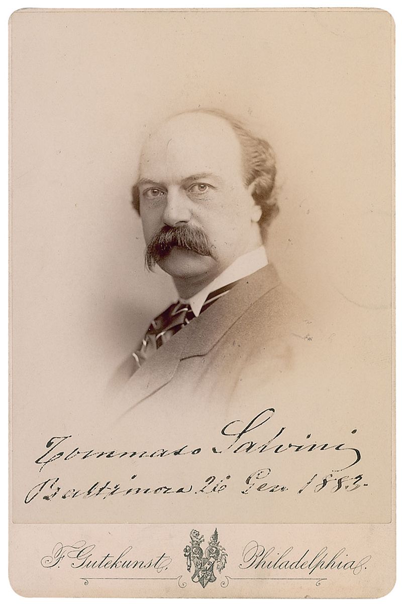 Renowned Italian stage actor (1829–1915). Vintage 4.25 x 6.5 cabinet photo by F. Gutekunst of Philadelphia, signed below the image in black ink, “Tommaso Salvini, Baltimora, 26. Gen. 1883.” Some irregular ink adhesion and light skipping to portions of sig