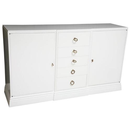 Description: Cabinet, server, dresser by Tommi Parzinger for Charak. Five drawers, two doors reveal two adjustable shelves. Charak stamp.