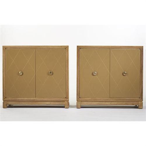 Tommi Parzinger<BR>cabinets, pair<BR>Charak Modern<BR>USA, c. 1960<BR>bleached mahogany, leather, brass<BR>36 w x 16.5 d x 34 h inches<BR>One cabinet features two doors concealing one adjustable shelf; other cabinet features two doors concealing one adjustable shelf and interior drawer. Signed with applied manufacturer's label to reverse of one example: [Charak Modern Inspected No. 1]. <BR><BR>Condition of the item is not included in this description. Condition reports are available from Wright upon request. Wright strongly recommends that you review a condition report for each item on which you plan to bid.