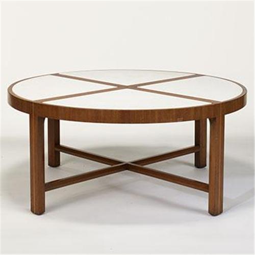 Tommi Parzinger<BR>coffee table<BR>Charak Modern<BR>USA, 1953<BR>mahogany, bleached mahogany, marble<BR>38 dia x 16.75 h inches<BR>Signed with decal manufacturer's mark to underside: [Charak Modern Inspected No.1 5-19-53].<BR><BR>Condition of the item is not included in this description. Condition reports are available from Wright upon request. Wright strongly recommends that you review a condition report for each item on which you plan to bid.
