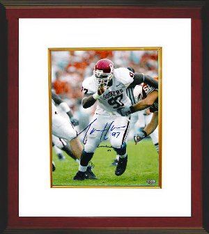 As one of the nation's top defensive prospects, Tommie Harris decided to attended the University of Oklahoma. He was a silent leader on and off the field leading by example. He is one of the very few players in OU history to start every game of his true freshman season. In his junior and final season as a Sooner, Harris won the Lombardi Award as the nation's best lineman in 2003. He was named to the Sports Illustrated All-Decade Team in 2009. Tommie Harris has hand autographed this Oklahoma Sooners 16X20 Color Photo with Lombardi 03 Inscription. Custom White Mat and Premium Wood Color Framed as shown. GTSM Hologram and Certificate of Authenticity from Athlon Sports.