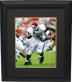 As one of the nation's top defensive prospects, Tommie Harris decided to attended the University of Oklahoma. He was a silent leader on and off the field leading by example. He is one of the very few players in OU history to start every game of his true freshman season. In his junior and final season as a Sooner, Harris won the Lombardi Award as the nation's best lineman in 2003. He was named to the Sports Illustrated All-Decade Team in 2009. Tommie Harris has hand autographed this Oklahoma Sooners 16X20 Color Photo with Lombardi 03 Inscription. Custom Black Mat and Premium Black Color Framed as shown. GTSM Hologram and Certificate of Authenticity from Athlon Sports.