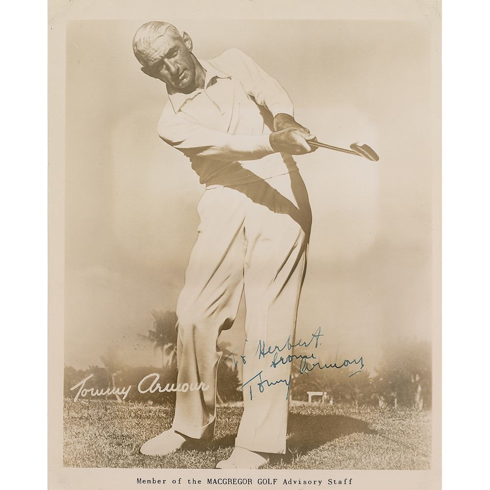 American golfer (1894–1968) who, despite suffering a severe eye injury during World War I, went on to win three major titles; he was elected to the World Golf Hall of Fame in 1976. Vintage glossy 8 x 10 MacGregor Golf publicity photo of Armour taking a swing, signed and inscribed in fountain pen, "To Herbert, from, Tommy Armour." In fine condition, with some light scratches and small creases. A great autographed pose of 'The Silver Scot.'