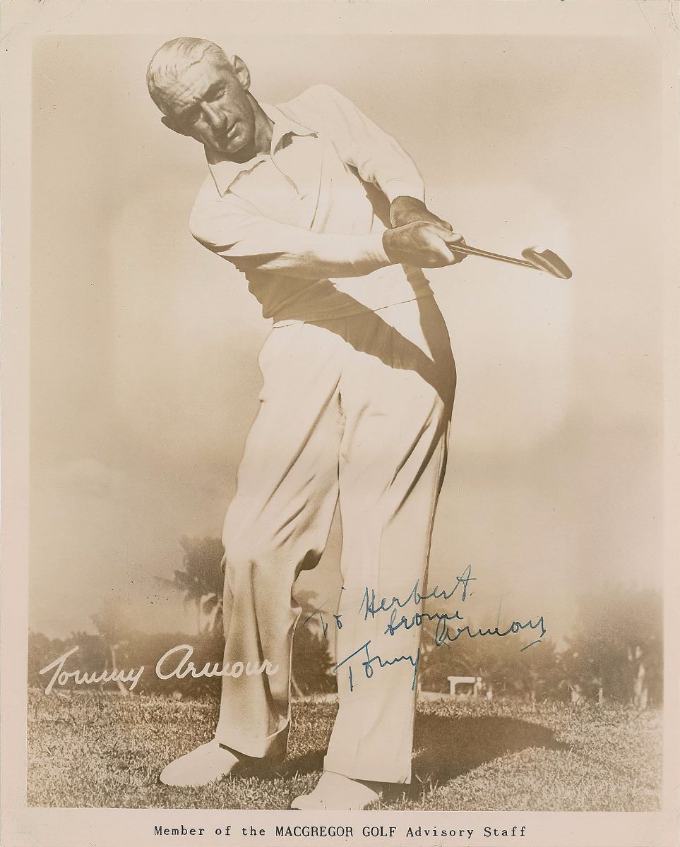 American golfer (1894–1968) who, despite suffering a severe eye injury during World War I, went on to win three major titles; he was elected to the World Golf Hall of Fame in 1976. Vintage glossy 8 x 10 photo of Armour following a swing and listing him as a member of the MacGregor Golf Advisory Staff, signed and inscribed in fountain pen, “To Herbert, from, Tommy Armour.” In fine condition, with some light scratches and small creases.