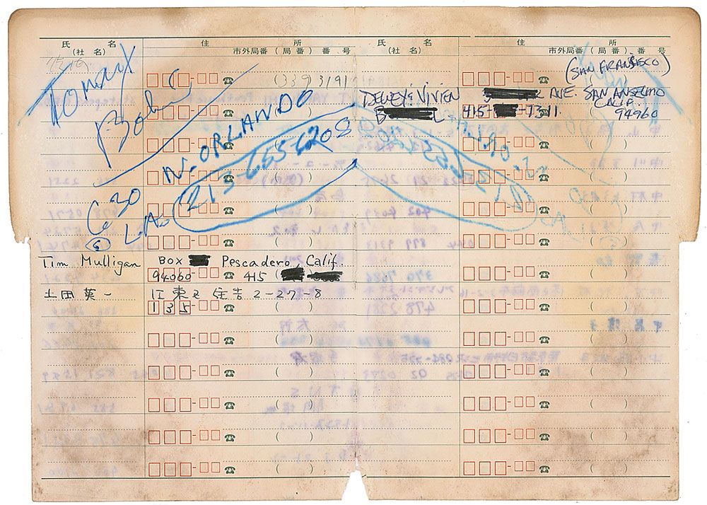American guitarist (1951–1976) who played with Zephyr, The James Gang, and Deep Purple, and who tragically died of a drug overdose at age 25. Page from a Japanese address book, 10 x 7, signed in-person in the upper left in blue ink, “Tommy Bolin, 630 N. Orlando, L. A., 213-655-6208.” Overall toning and soiling, a few small edge tears, some mild haloing to ink, mirroring of ink to right page, and some show-through from writing to opposing sides, otherwise very good condition. Consignor notes that the page was signed while Bolin was on tour with Deep Purple in Japan. A decidedly scarce signature.