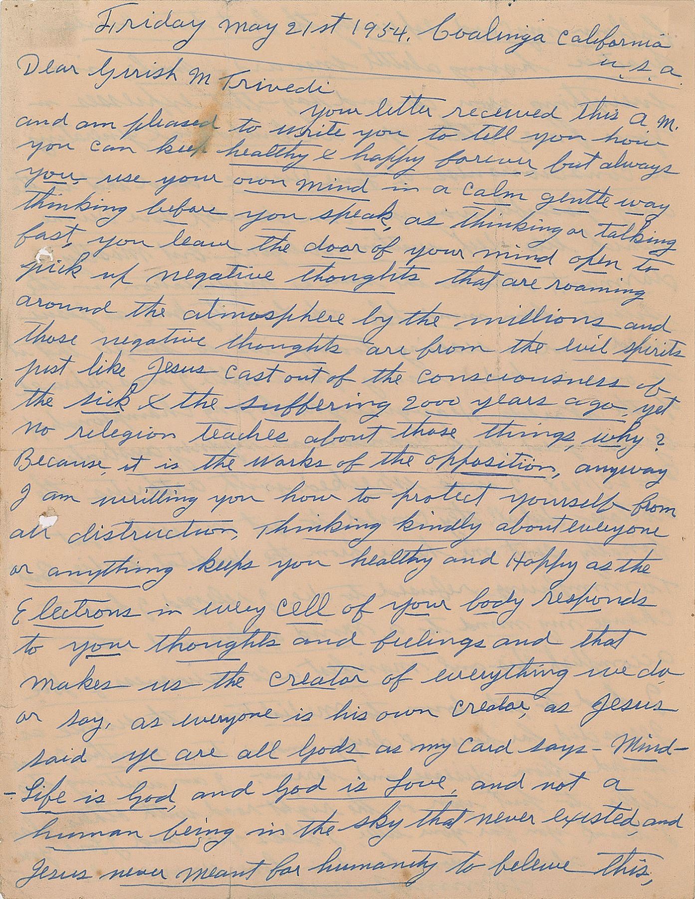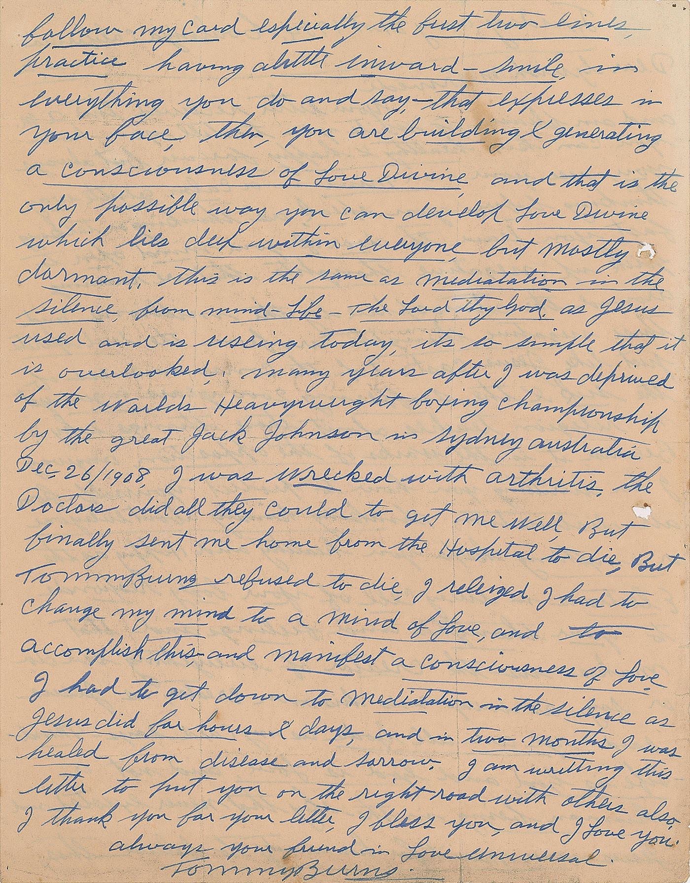 ALS, one page both sides, 8.5 x 11, May 21, 1954. Interesting letter on "how you can keep healthy & happy forever," in part: "Use your own mind in a calm gentle way thinking before you speak, as thinking or talking fast, you leave the door of your mind open to pick up negative thoughts that are roaming around the atmosphere by the millions and those negative thoughts are from the evil spirits just like Jesus cast out of the consciousness of the sick & the suffering 2000 years ago, yet no religion teaches about those things, why? Because, it is the works of the opposition…Life is God, and God is Love, and not a human being in the sky that never existed, and Jesus never meant for humanity to believe this…Many years ago, I was deprived of the World's Heavyweight boxing championship by the great Jack Johnson in Sydney Australia Dec. 26/1908, I was wrecked with arthritis, the Doctors did all they could to get me well, but finally sent me home from the hospital to die, by Tommy Burns refused to die, I realized I had to change my mind to a mind of Love, and to accomplish this, and manifest a consciousness of Love, I had to get down to meditation in the silence as Jesus did for hours & days, and in two months I was healed from disease and sorrow." In very good to fine condition, with two file holes to the left side.