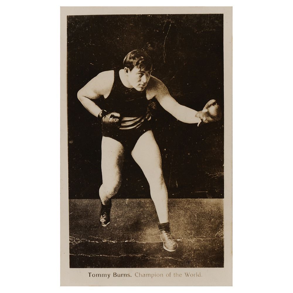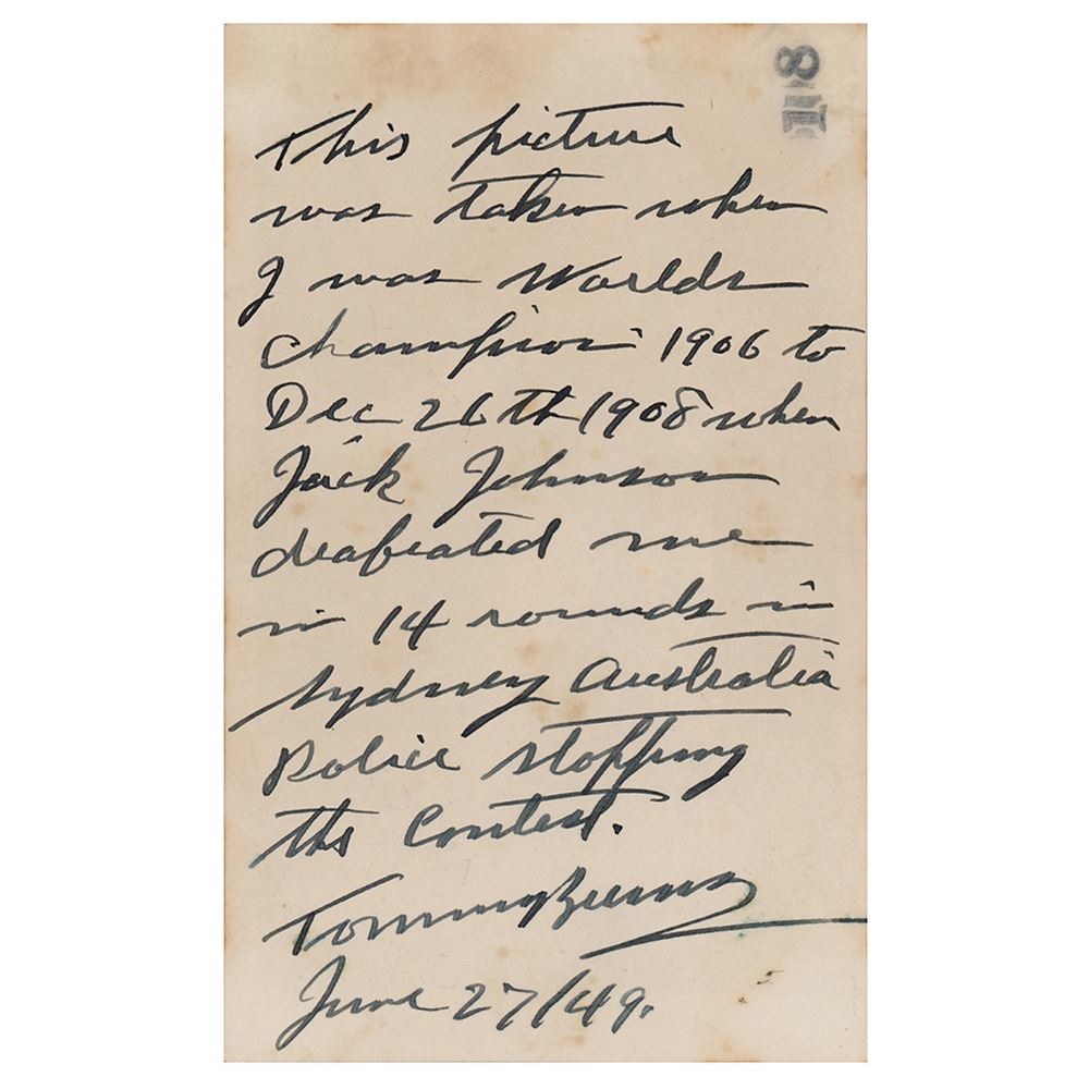 Vintage glossy 3 x 4.75 full-length photo of Burns in a pugilistic pose, signed on the reverse in black ink, "Tommy Burns, June 27/49," who adds above: "This picture was taken when I was Worlds Champion, 1906 to Dec 26th 1908 when Jack Johnson defeated me in 14 rounds in Sydney Australia, police stopping the contest." In fine condition, with some small creases to the image.