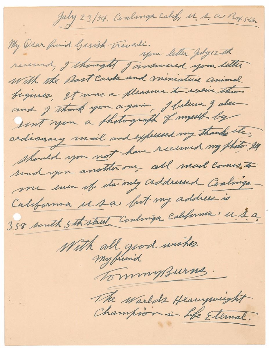 Boxing Hall of Famer (1881–1955) who was the heavyweight boxing champion of the world from 1906 through 1908. ALS signed “Tommy Burns, The World’s Heavyweight Champion in Life Eternal,” one page, 8.5 x 11, July 23, 1954. Letter to an admirer, in part: “It was a pleasure…and I thank you again, I believe I also sent you a photograph of myself by ordinary mail and expressed my thanks etc., should you not have received my photo, I’ll send you another one.” In fine condition, with two punch holes to the left edge.