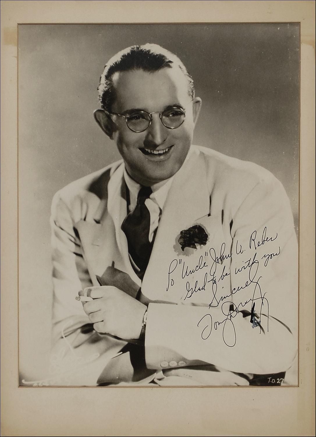 Vintage matte-finish 11 x 14 photo, signed and inscribed in fountain pen “To ‘Uncle’ John U. Reber, Glad to be with you. Sincerely, Tommy Dorsey.” Matted to an overall size of 12 x 16. In fine condition.