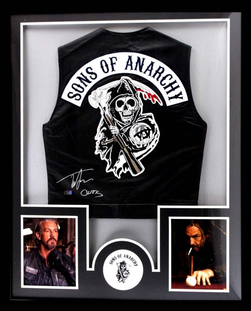 Custom framed vest measures 34†x 42†in size. Hand-signed and inscribed in silver paint pen by Tommy Flanagan (Chibs).