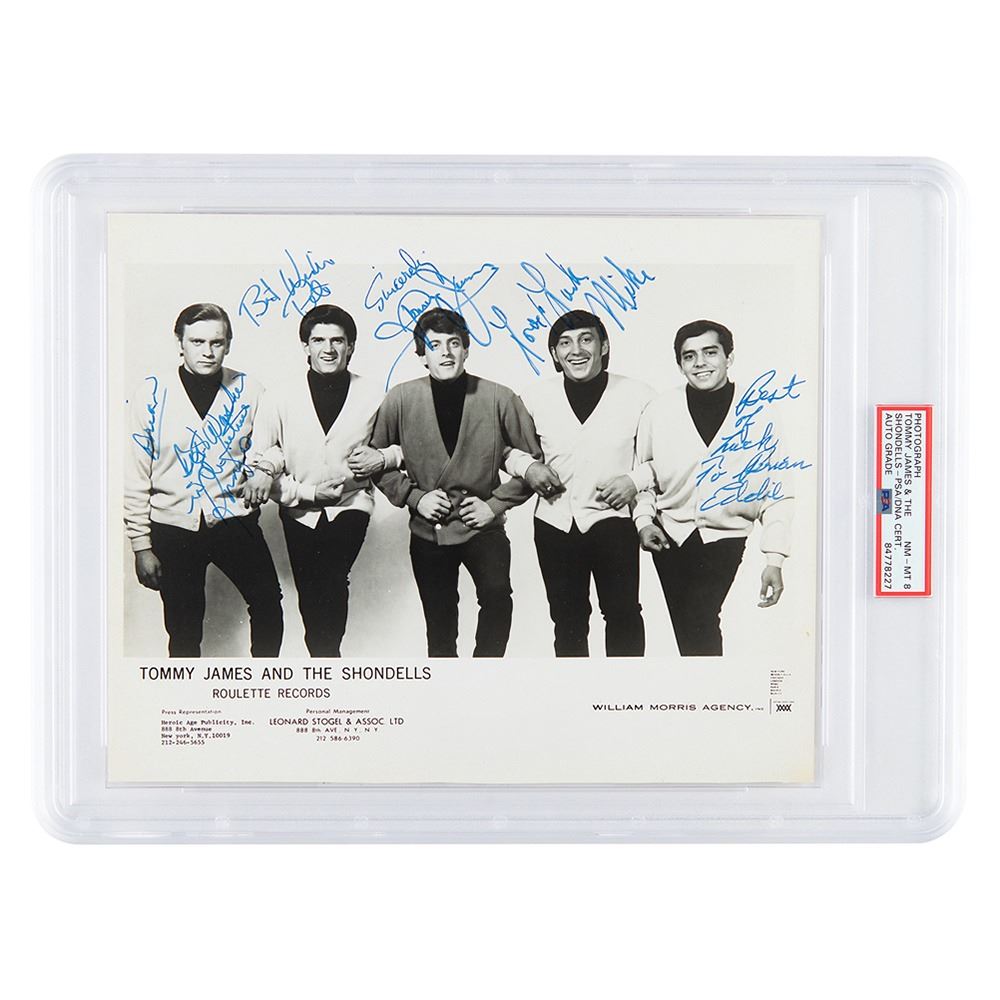 Vintage glossy 10 x 8 group publicity photo of Tommy James and the Shondells posing together, signed in blue felt tip by Tommy James, Mike Vale, Ronnie Rosman, Pete Lucia, and Eddie Gray, who adds an inscription. In fine condition. Encapsulated and graded by PSA/DNA as "NM-MT 8."