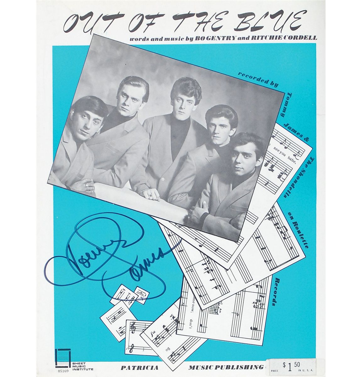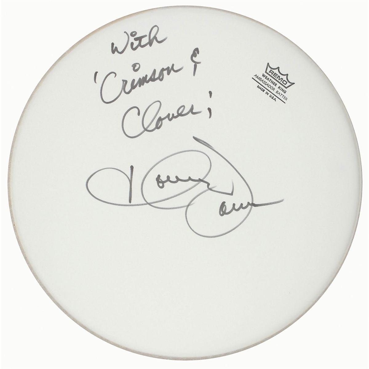 Two items: unused 14-inch coated Remo drumhead signed in black felt tip, “With Crimson & Clover, Tommy James”; and “Out of the Blue” sheet music, four pages, signed on the front in black felt tip, “Tommy James.” In overall fine condition with the original price sticker affixed to the sheet music.