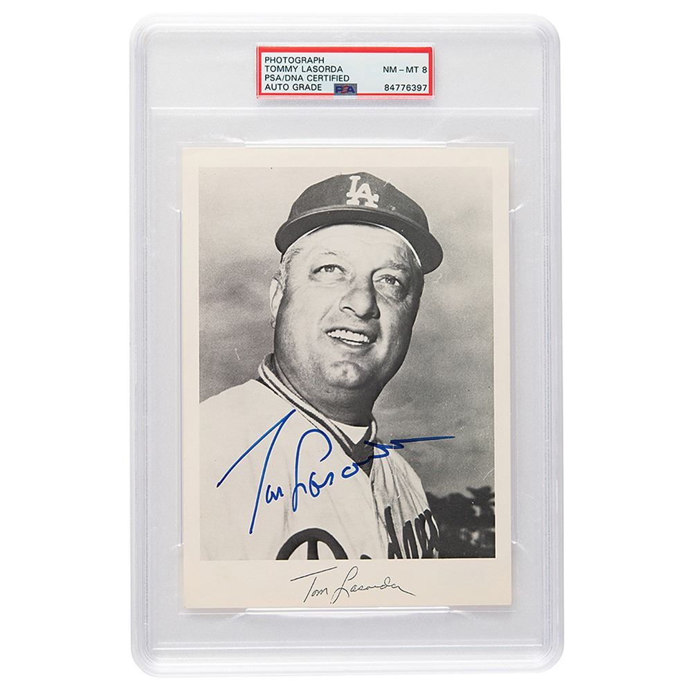 Cardstock 5 x 7 photo of Tommy Lasorda in his Los Angeles Dodgers uniform, signed in blue felt tip. Also bears a pre-printed facsimile signature in the lower border. In fine condition. Encapsulated and graded by PSA/DNA as "NM-MT 8."